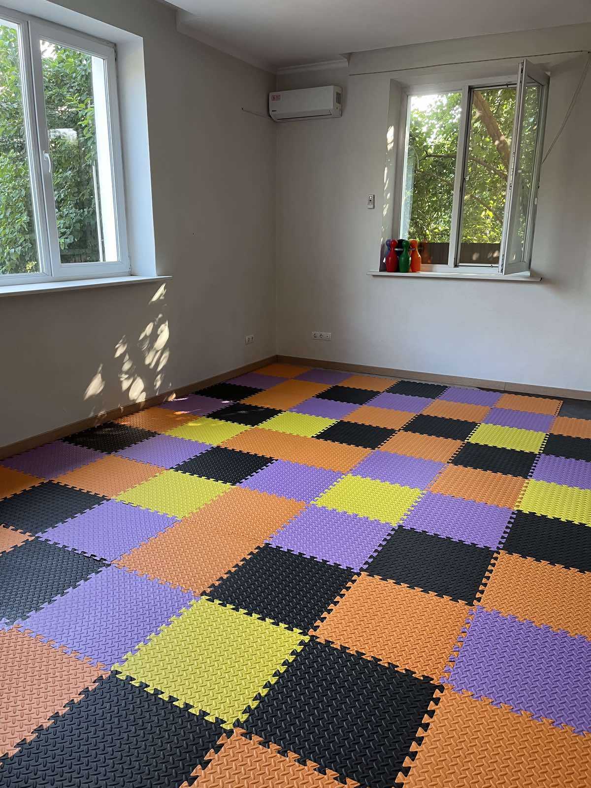 Плитки 50×50 см мають з’єднання “пазл”, завдяки чому підлогу можна легко зібрати та розібрати без спеціальних інструментів. Це дає можливість комбінувати кольори, створюючи яскраві й веселі ігрові зони.